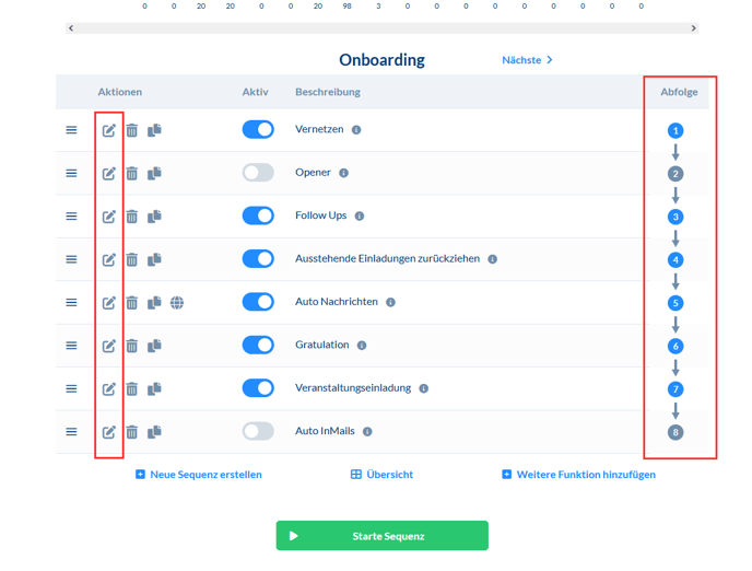 Bei der Arbeit mit CompLeadly ist es wichtig zu verstehen, dass die Sequenzfunktionen in einer festgelegten Reihenfolge ablaufen. Jede Funktion in der Sequenz wird von oben nach unten ausgeführt, bis das für den Tag festgelegte Limit erreicht ist. Dies gilt auch für die Pausenfunktion. Die Abfolge sieht beispielsweise so aus: