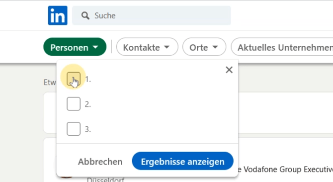 Wenn du mehr als die genannten Ergebnisse an direkten Kontakten in deinem Netzwerk hast, dann musst du die Zielgruppe z.B. mit dem Filter "Orte" oder "Region" so runterfiltern, dass auf unter 1000 bzw. unter 2500 Ergebnisse kommst.