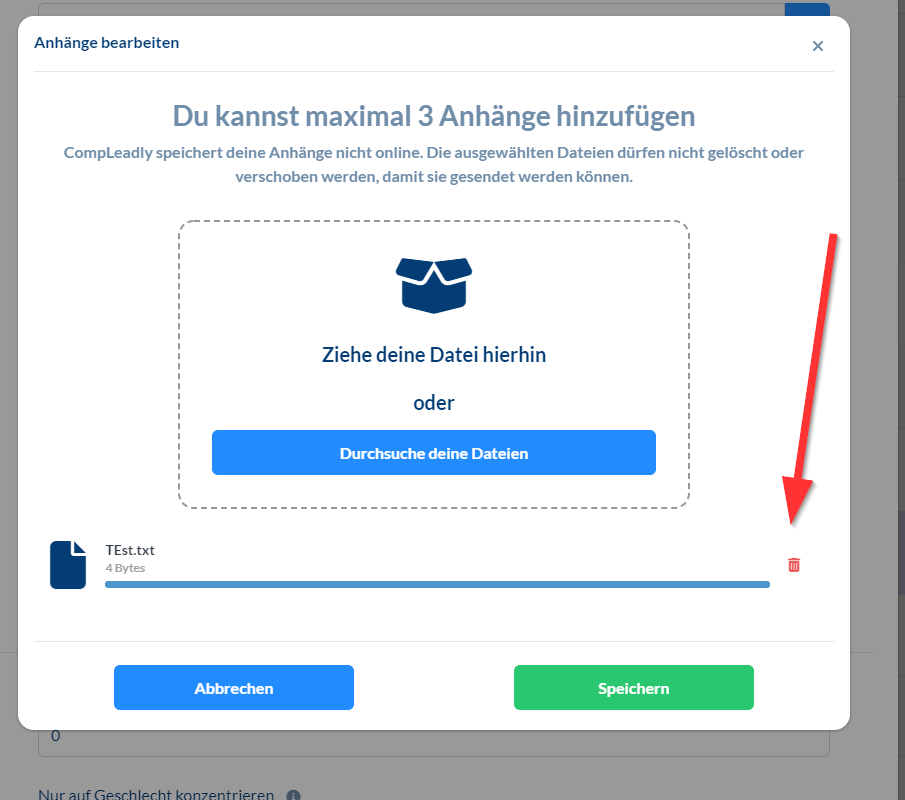 Anhang wird nicht versendet Gehe wie folgt vor: 1. Öffne die Anhang Funktion neben dem Textfeld 2. Lösche deine Anhänge 3. Klicke auf Speichern 4. Öffne die Anhangfunktion 5. Füge den Anhang erneut hinzu 6. Drücke auf speichern 7. Versuche es erneut