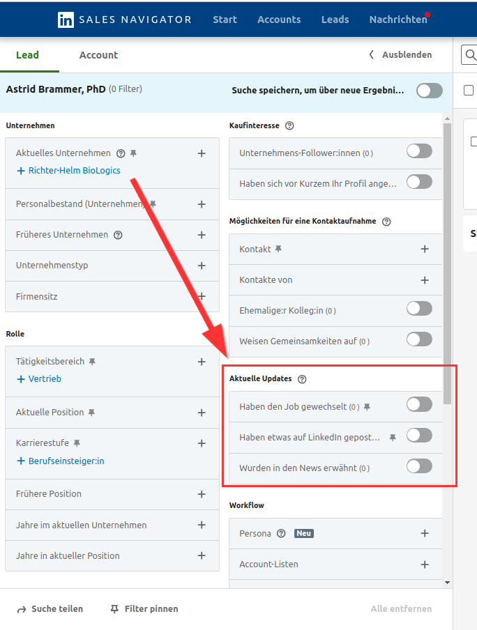 2. Lege einen neuen Suchauftrag an: Klicke auf "Lead-Filter" und beginne, deine Kriterien festzulegen.