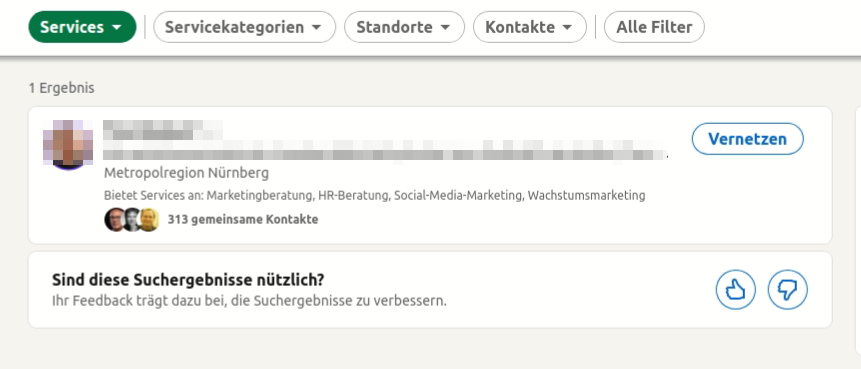 Kann Nachrichtenschaltfläche nicht anklicken / Cannot click message button Wenn du eine Servicesuche verwendest, kann es sein, dass der Kontakt keine InMail Nachricht zulässt, sondern nur vernetzen