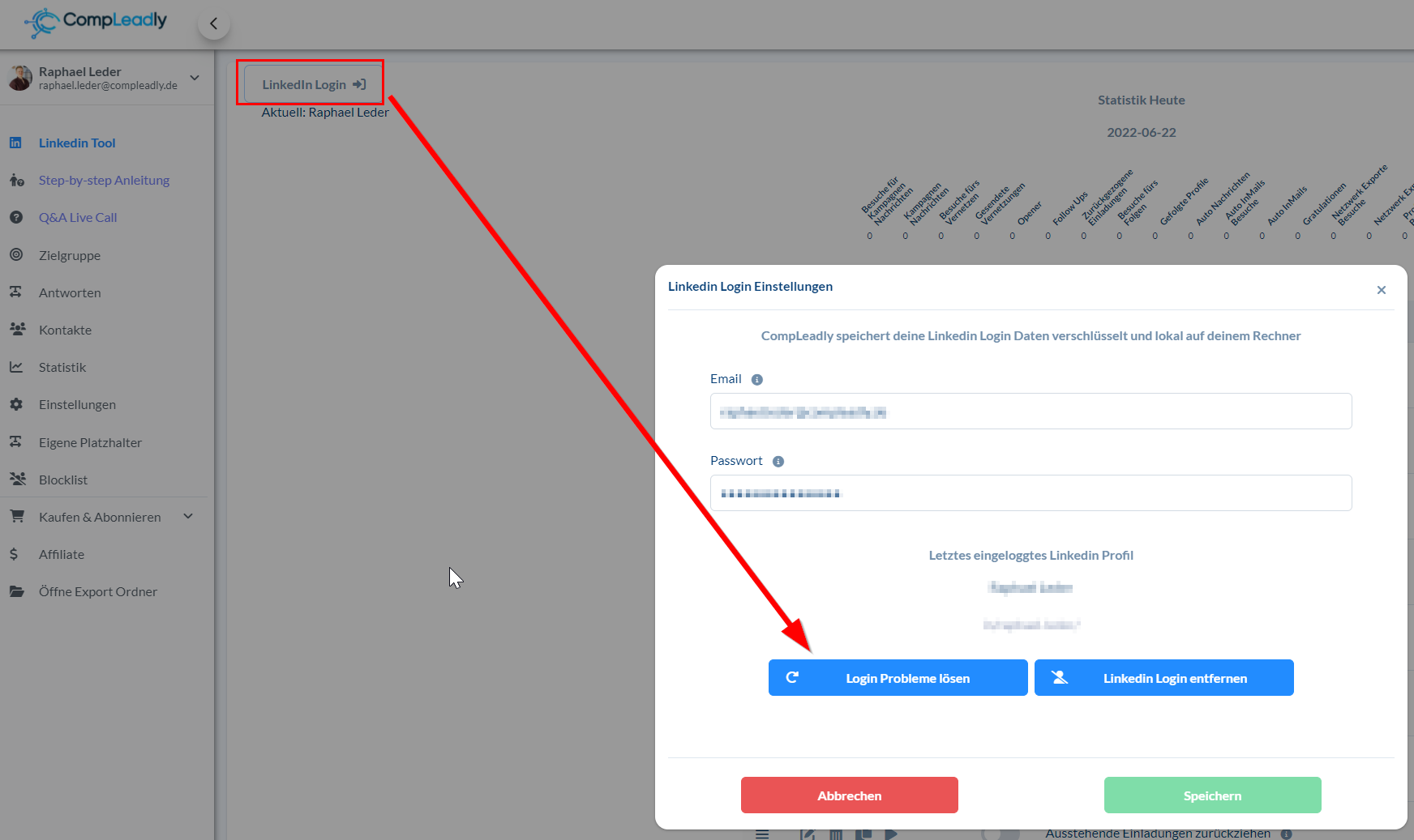 Achte auch darauf, dass genau diese LinkedIn Login Daten in CompLeadly hinterlegt sind.