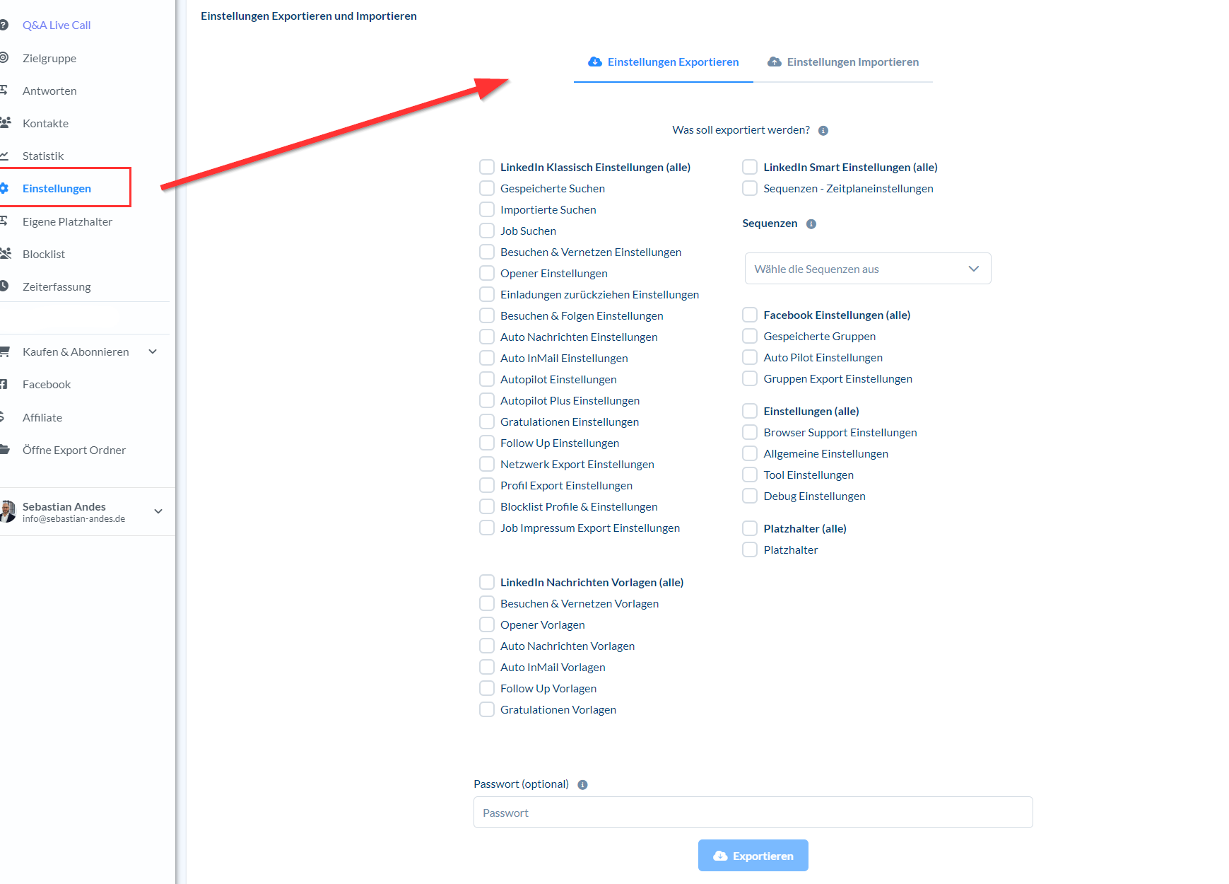 Du kannst die Einstellungen aus dem alten CompLeadly-Account einfach exportieren und in den neuen CompLeadly-Account importieren. Diese Option findest du links in den Einstellungen in CompLeadly.