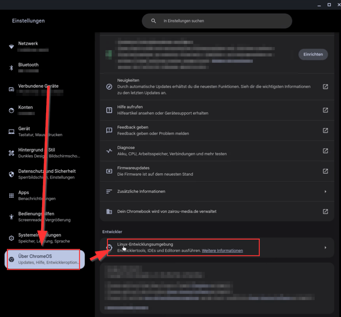 - Gehe zu Einstellungen und dann auf Linux-Entwicklungsumgebung ➔ Klicke evtl. auf einrichten