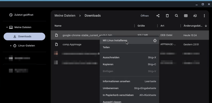 - Gehe in deinen Download Ordner und installiere die Chrome Datei für Linux mit Rechtsklick auf die Datei ➔ Mit Linux installieren