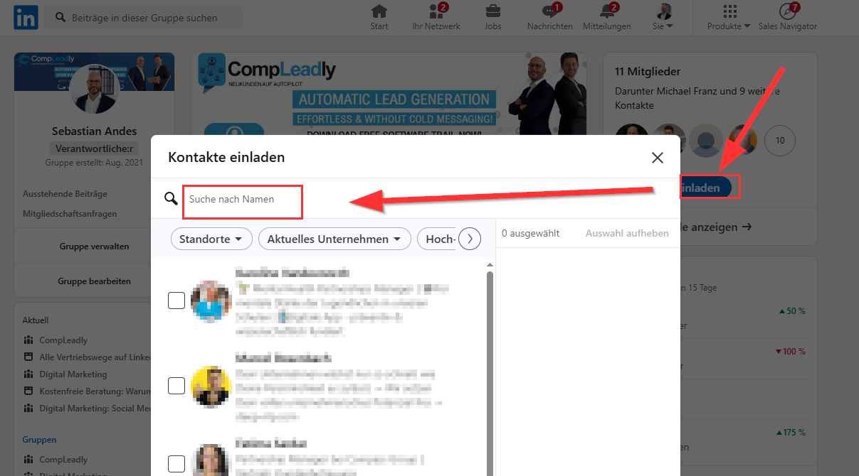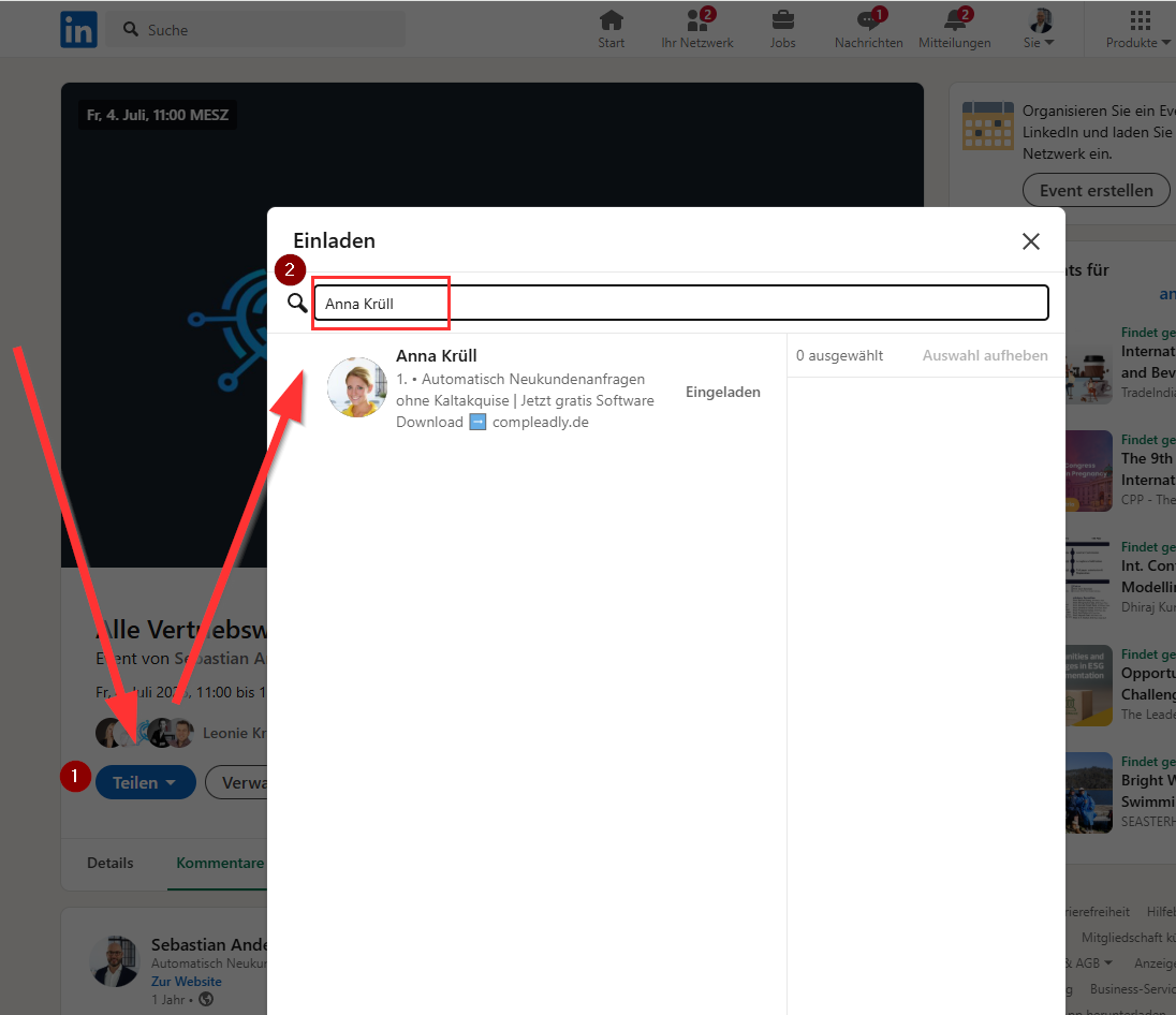 PrĂŒfe bitte in der Funktion z.B. Veranstaltungen bzw. Events oder Gruppe oder "Follower zur Unternehmensseite" einladen, ob der Kontakt bereits eingeladen wurde. Schicke uns einen Screenshot