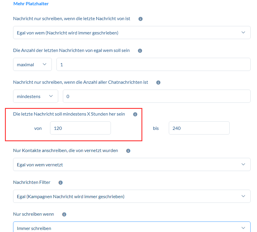 Letzte Nachricht jünger als minimale Zeit / Last message younger than min time Die letzte Nachricht des geprüften Kontakts ist jünger als dein eingestelltes Mindestalter unter "Die letzte Nachricht soll mindestens x Stunden her sein"