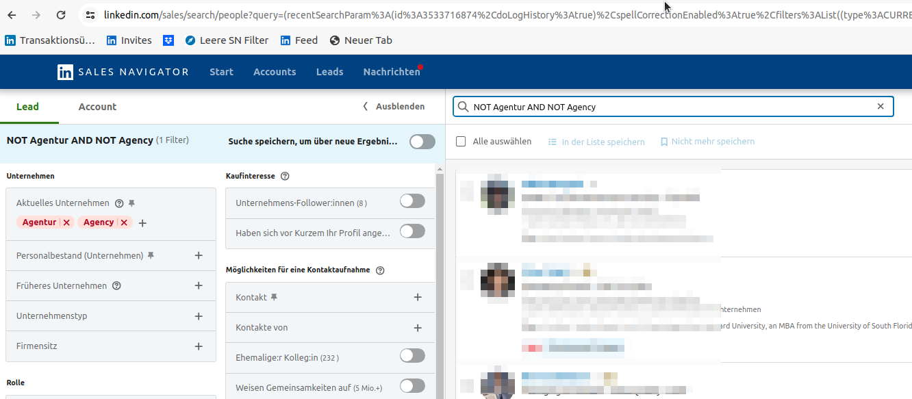 Wenn du flexibel in deiner Suche sein willst, hilft der Operator OR. Die Eingabe von „Vertrieb OR Marketing OR Werbung“ zeigt Profile an, die mindestens einen dieser Begriffe enthalten. So erhältst du mehr Optionen.