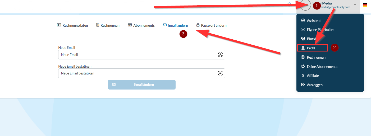 E-Mail in CompLeadly ändern Klicke oben rechts auf deinen Namen ➔ Klicke auf Profil ➔ Klicke im Reiter auf E-Mail Ändern