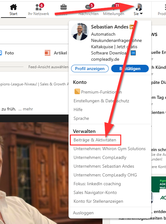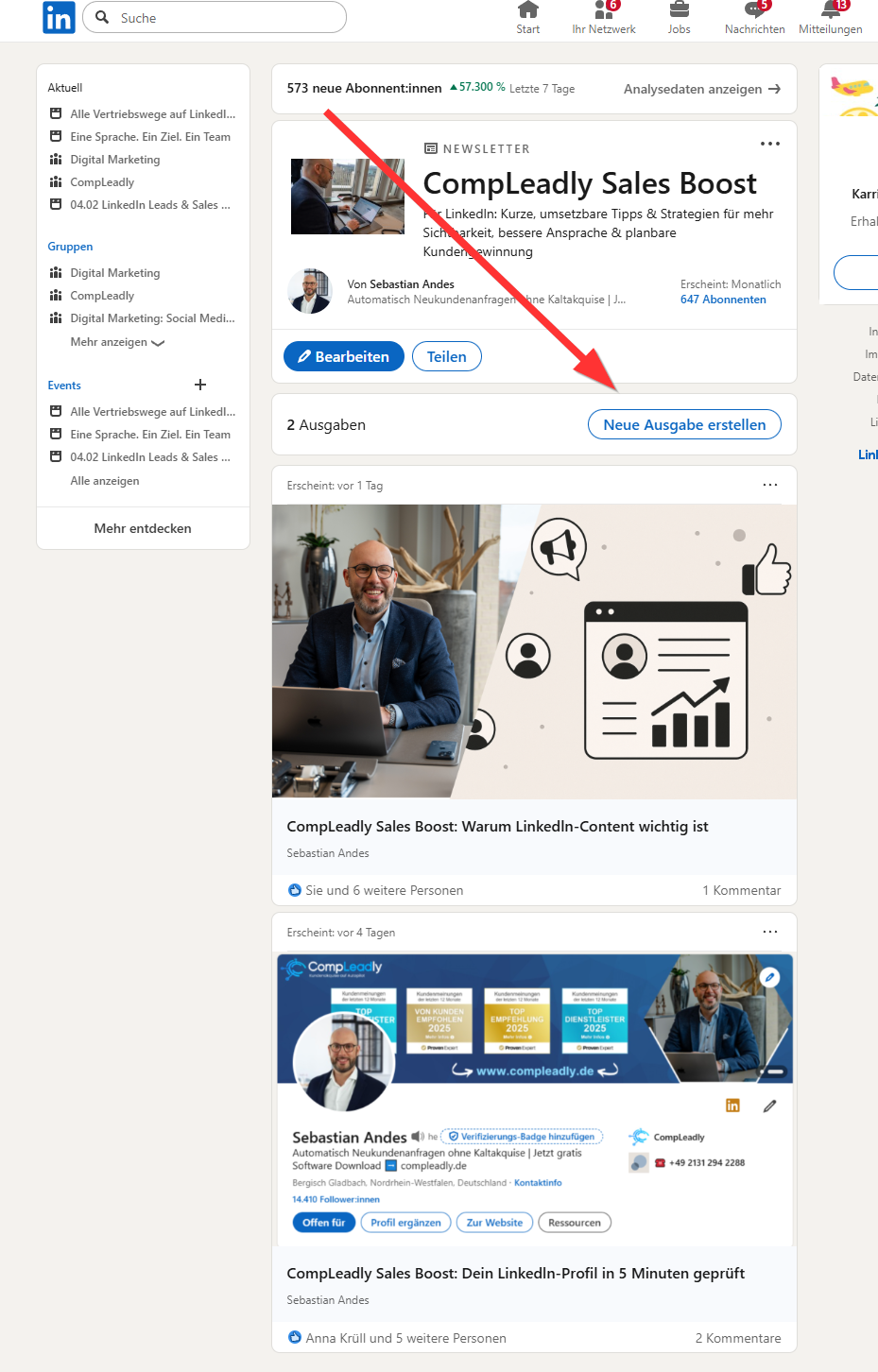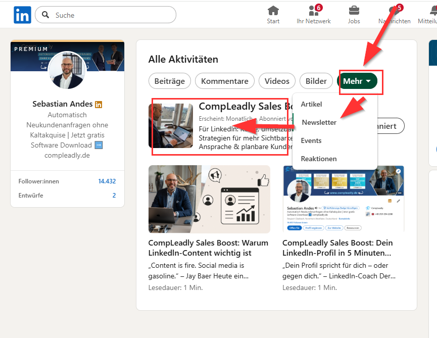 Eigenen Newsletter auf LinkedIn finden Direkter Link https://www.linkedin.com/in/me/recent-activity/newsletter/ Manueller Weg