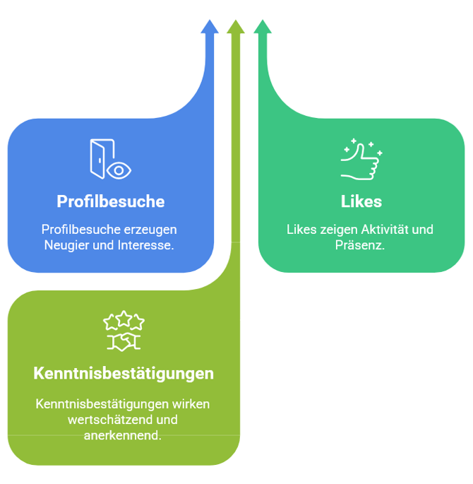 Sichtbarkeit: Nur wer gesehen wird, kann in Erinnerung bleiben. Kleine Aktionen wie Liken, Folgen und Profilbesuche erzeugen Aufmerksamkeit ohne Aufwand.
