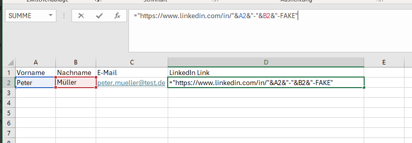 ="https://www.linkedin.com/in/"&A2&"-"&B2&"-FAKE"In diesem Beispiel bezieht sich