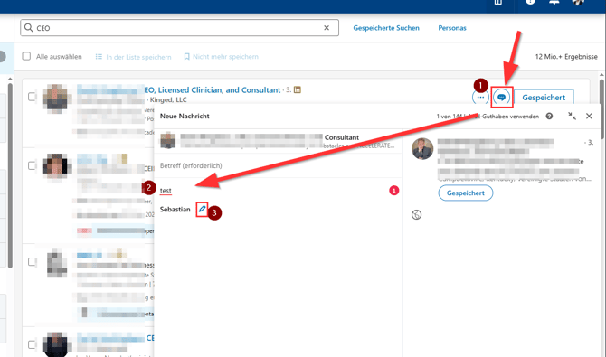 1. Öffne eine Suche im Sales Navigator (LINK) und öffne das Nachrichtenfeld (1) für einen Kontakt zweiten oder dritten Grades.