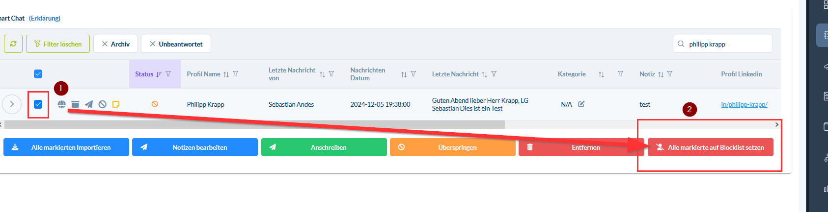 Kontakte aus Smart Chat in Blocklist setzen S 1) Kontakt(e) markieren 2) Roter Button: "Alle Markierte auf Blocklist setzen"