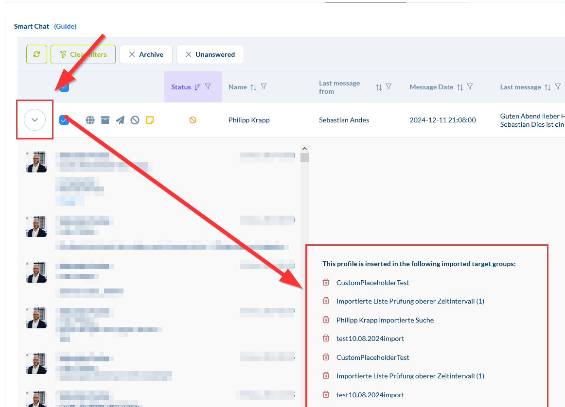 Klicke auf den Pfeil beim Kontakt, um zu sehen, in welchen Zielgruppen dieser Kontakt bereits gespeichert ist.