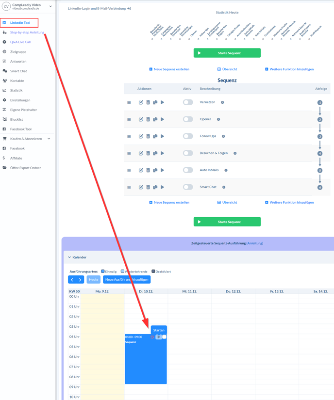 Alternativ kannst du Sequenzen auch in der Kalenderansicht starten. Suche die entsprechende Sequenz und klicke dort auf den Play-Button. Dieser Button erfüllt die gleiche Funktion wie der Start-Button in der Sequenzansicht.