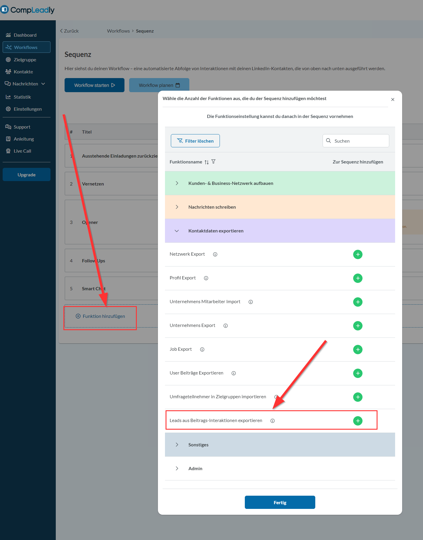 - Gehe in deinem CompLeadly-Worfklow auf Funktion hinzufügen.