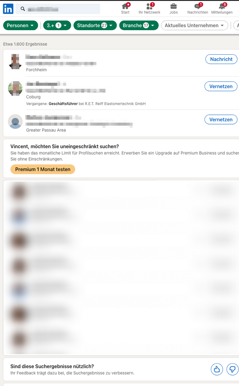 LinkedIn erlaubt dir keine weiteren Suchen aufzurufen. Du musst einen bezahlten LinkedIn Account besitzen. Wenn du deine Suche mit dem Globus öffnest, siehst du, was los ist.