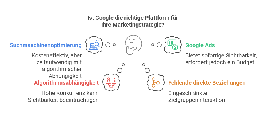 Google eignet sich besonders, wenn Menschen aktiv nach einer Lösung suchen. Hier kannst du durch Suchmaschinenoptimierung (SEO) oder bezahlte Anzeigen (Google Ads) gezielt Personen erreichen, die konkrete Herausforderungen haben. Der Nachteil: Du bist von Algorithmen und der Konkurrenz abhängig. Um auf Platz 1 zu kommen, benötigst du Zeit, Ressourcen oder ein ausreichendes Budget für Anzeigen. Zudem fehlen dir oft direkte Beziehungen zu deiner Zielgruppe.