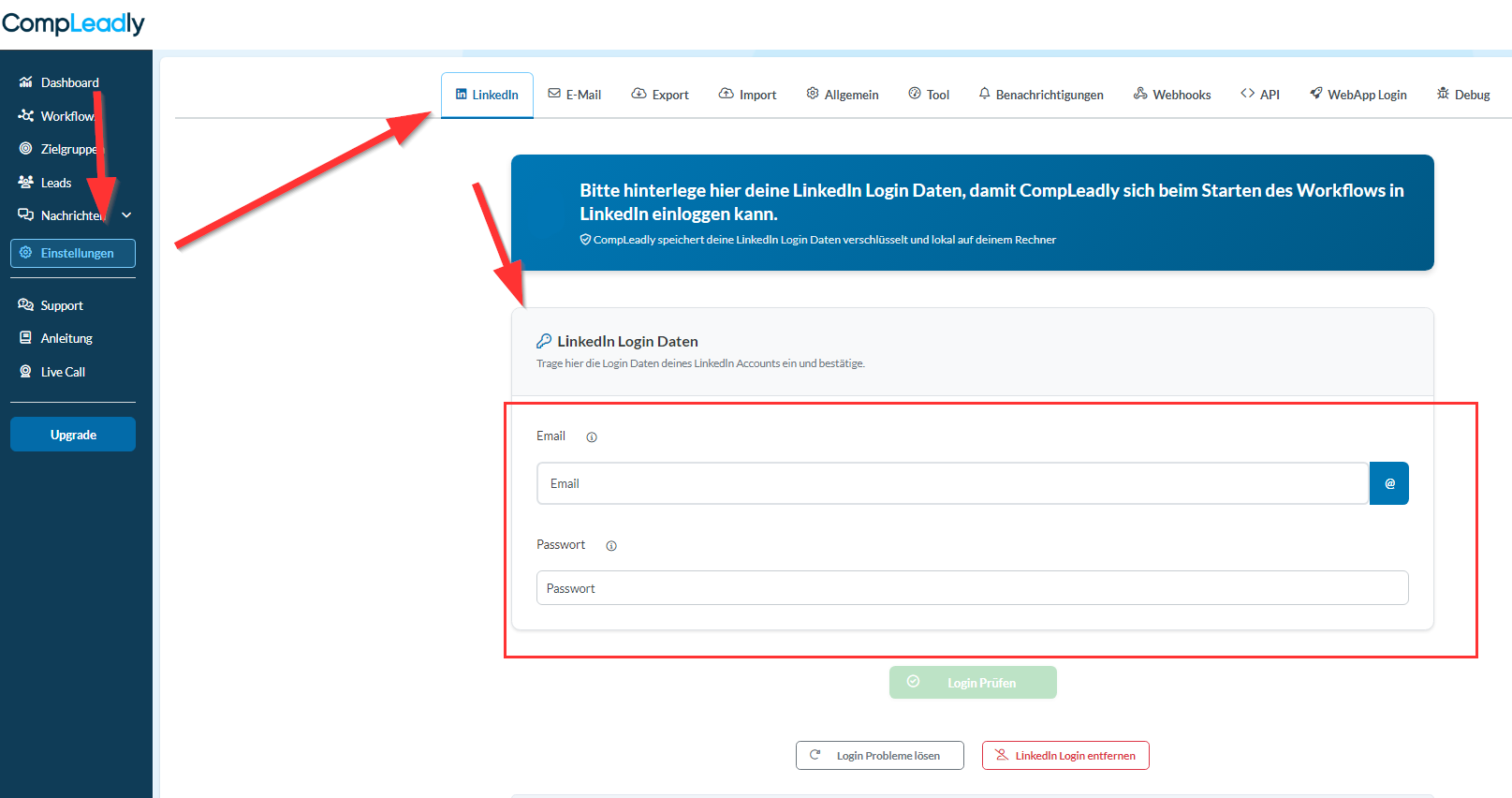 Du kannst das Passwort erst dann neu eingeben, wenn du vorher auf „LinkedIn Login entfernen“ klickst. Dadurch werden die gespeicherten Zugangsdaten gelöscht und die Eingabefelder wieder freigeschaltet.