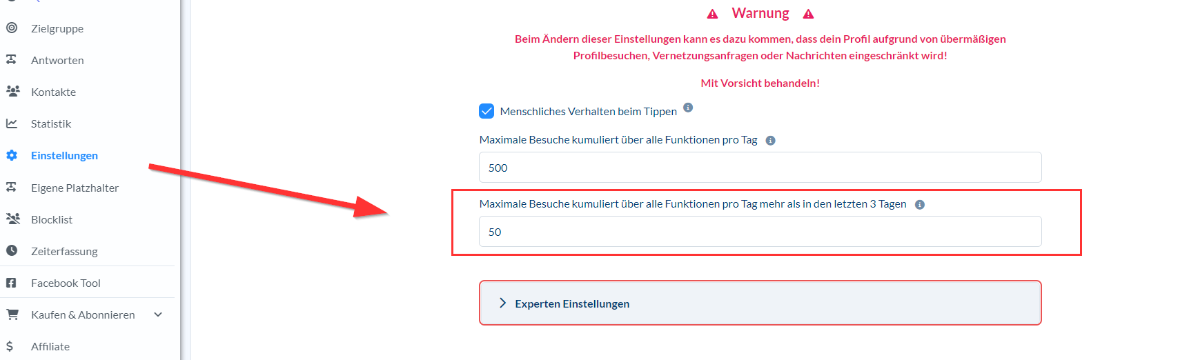 Du hast in den letzten drei Tagen jeweils 100 Leute pro Tag besucht (z.B. wegen Kampagnennachricht oder Vernetzen). Dann darfst du heute 150 Leute besuchen - Morgen 200, übermorgen 250 usw. bis max. 500.