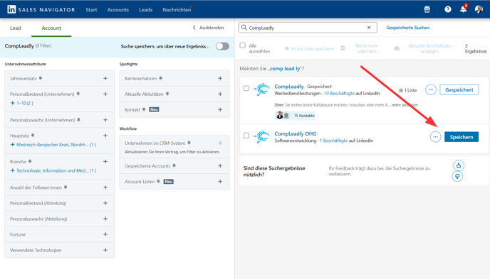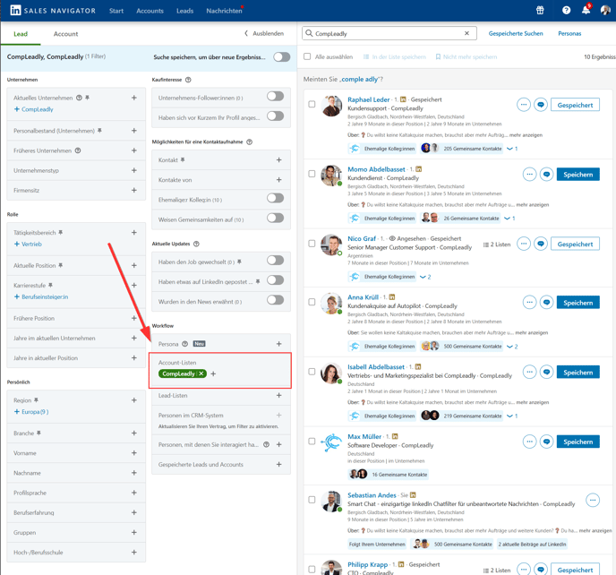 Wie du Firmen (Accounts) in eine Account Liste speichern und diese dann in der Sales Navigator Personensuche (Leads) verwenden. Dort werden dann die Mitarbeiter angezeigt, die du wiederum filtern kannst.