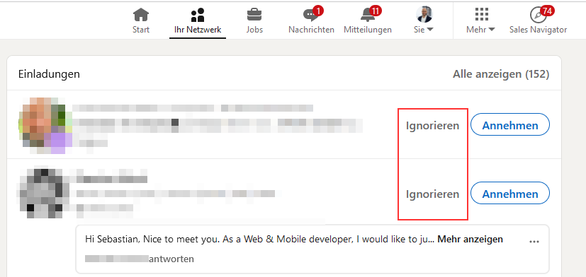 - Je mehr ausstehende Vernetzungsanfragen du hast, desto mehr Leute haben die Möglichkeit, bei deiner Einladung auf ignorieren zu klicken