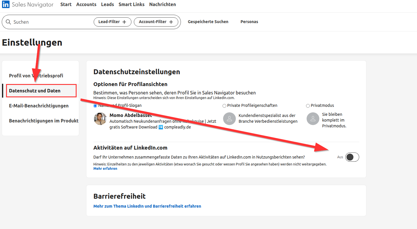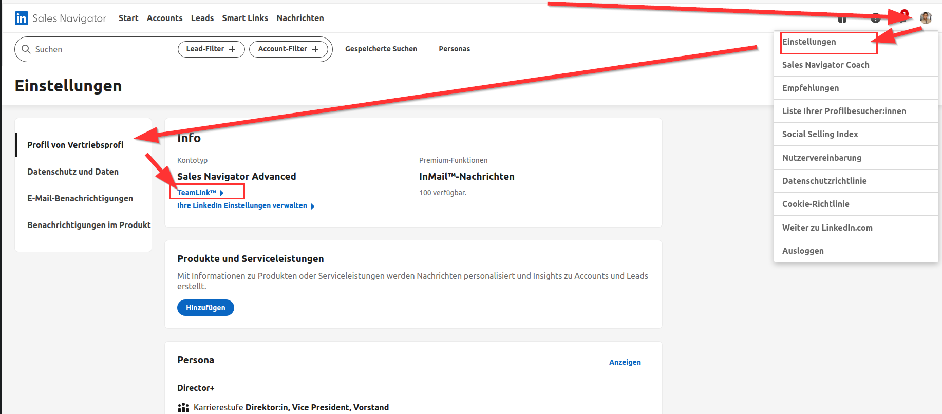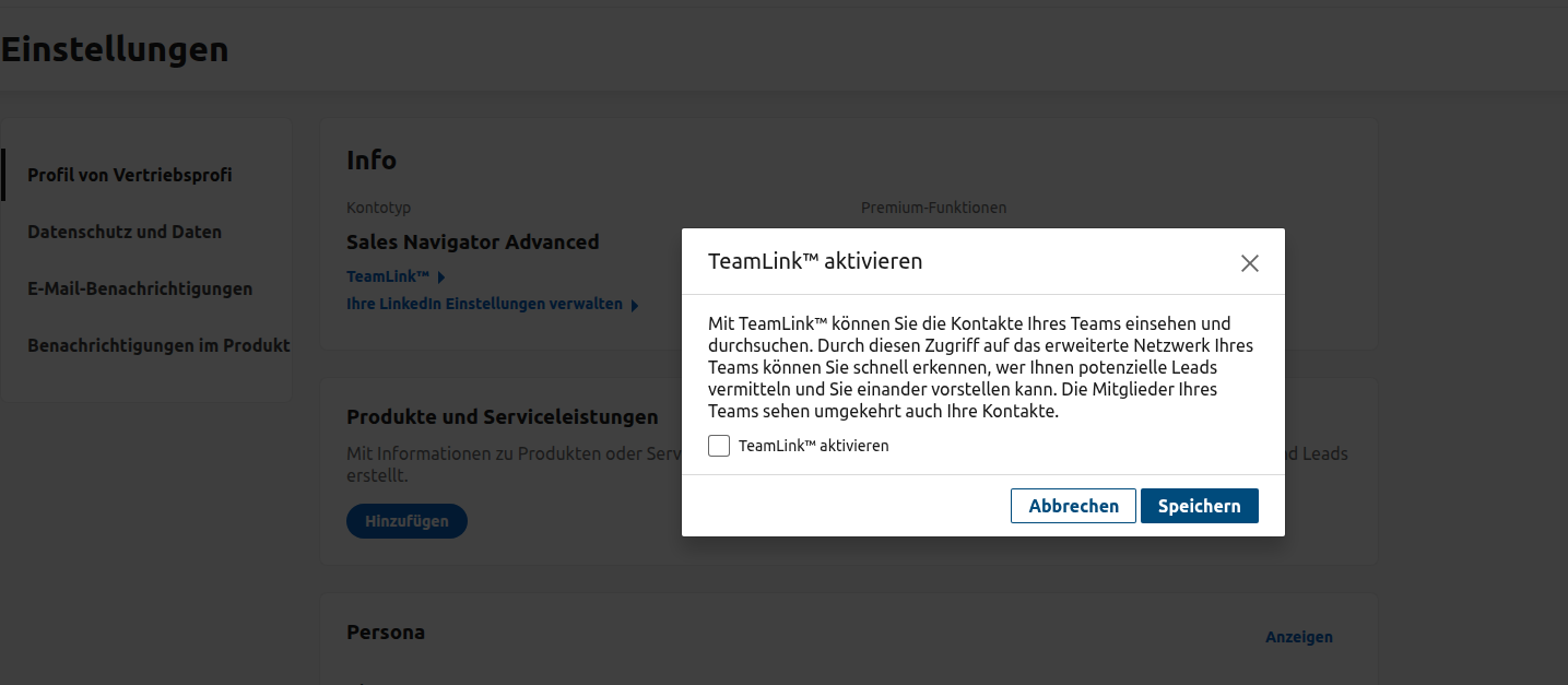 Da du einem Team hinzugefügt wurdest, empfehlen wir, die Sales Navigator Teams Funktionen zu deaktivieren, damit niemand deine Aktivitäten und Kontakte sehen kann.