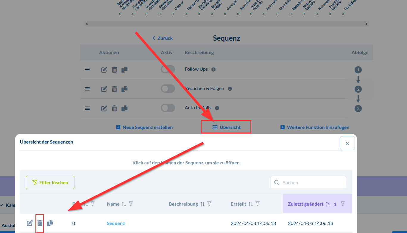 Sequenzen löschen Klicke auf die Übersicht Klicke auf das Papierkorbsymbol bei der Sequenz, die du löschen möchtest.