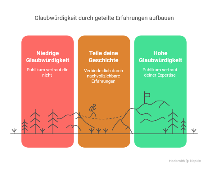 Erzähl offen, wie du selbst an dein Ziel gekommen bist – ob du z. B. dein Gewicht reduziert hast, ein Business aufgebaut oder ein Team geführt hast. Wenn deine Zielgruppe sieht: "Du warst mal genau da, wo ich heute stehe", steigt die Glaubwürdigkeit enorm.