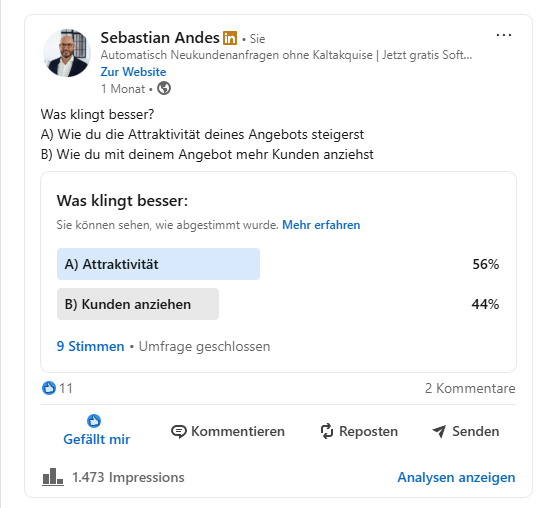 Du veröffentlichst eine kurze Umfrage oder einen Post mit zwei einfachen Auswahlmöglichkeiten. Wer klickt, zeigt Interesse – diese Personen sind deine interessierten Leads, die du gezielt ansprechen kannst.