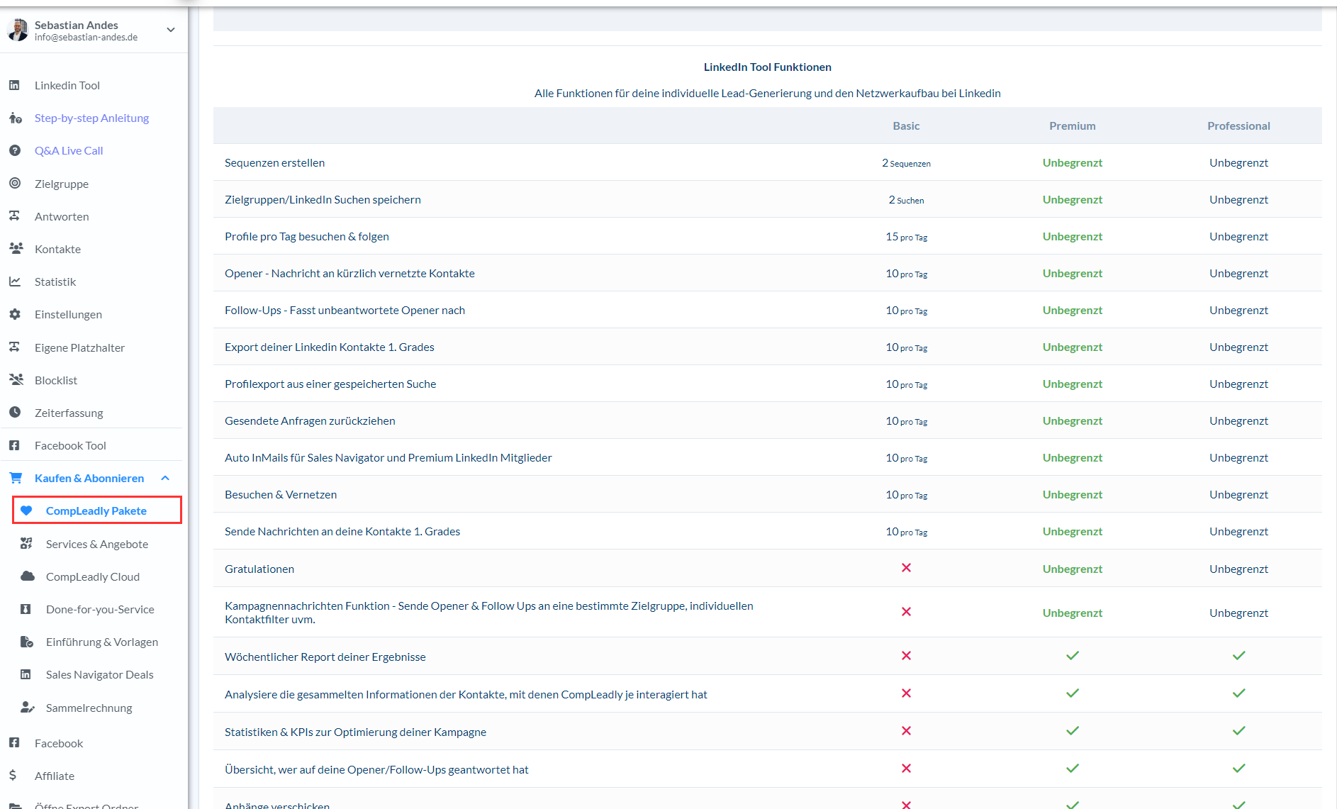 Unterschiede Premium vs. Basic Die wesentlichen Unterschiede von unserem Premium und Basic Paket Vergrößern In diesem Menüpunkt in CompLeadly findest du die vollständige Funktionstabelle mit einer Übersicht für die Pakete.