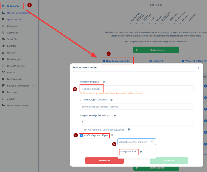 - Klicke im Menü auf der linken Seite auf das LinkedIn Tool (1).