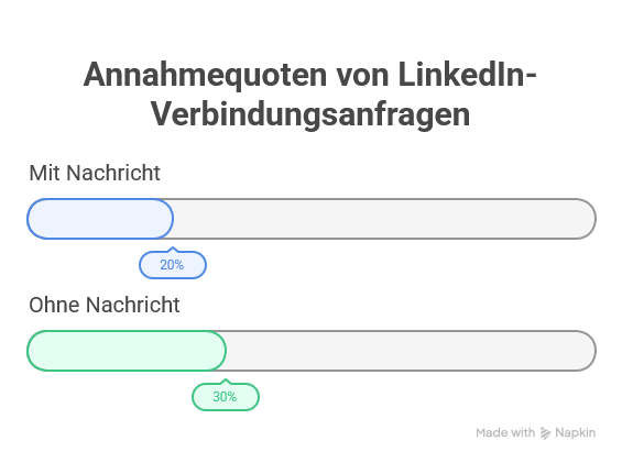 Während du mit Nachricht eventuell bei 20 % Annahmequote liegst, kann der Wert ohne Nachricht auf über 30 % steigen – einfach, weil die Anfrage weniger „nach Akquise“ aussieht.