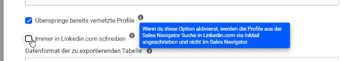 Sichtbarkeit deiner Nachricht bei Kontakten mit Sales Navigator: Personen, die den Sales Navigator nutzen, erhalten die Nachrichten dort, wo du schreibst. Das bedeutet, dass die Kontakte, die den Sales Navigator haben, aktiv in der Sales Navigator Checkbox prüfen müssen, wenn du die Checkbox im Screenshot nicht auswählst.