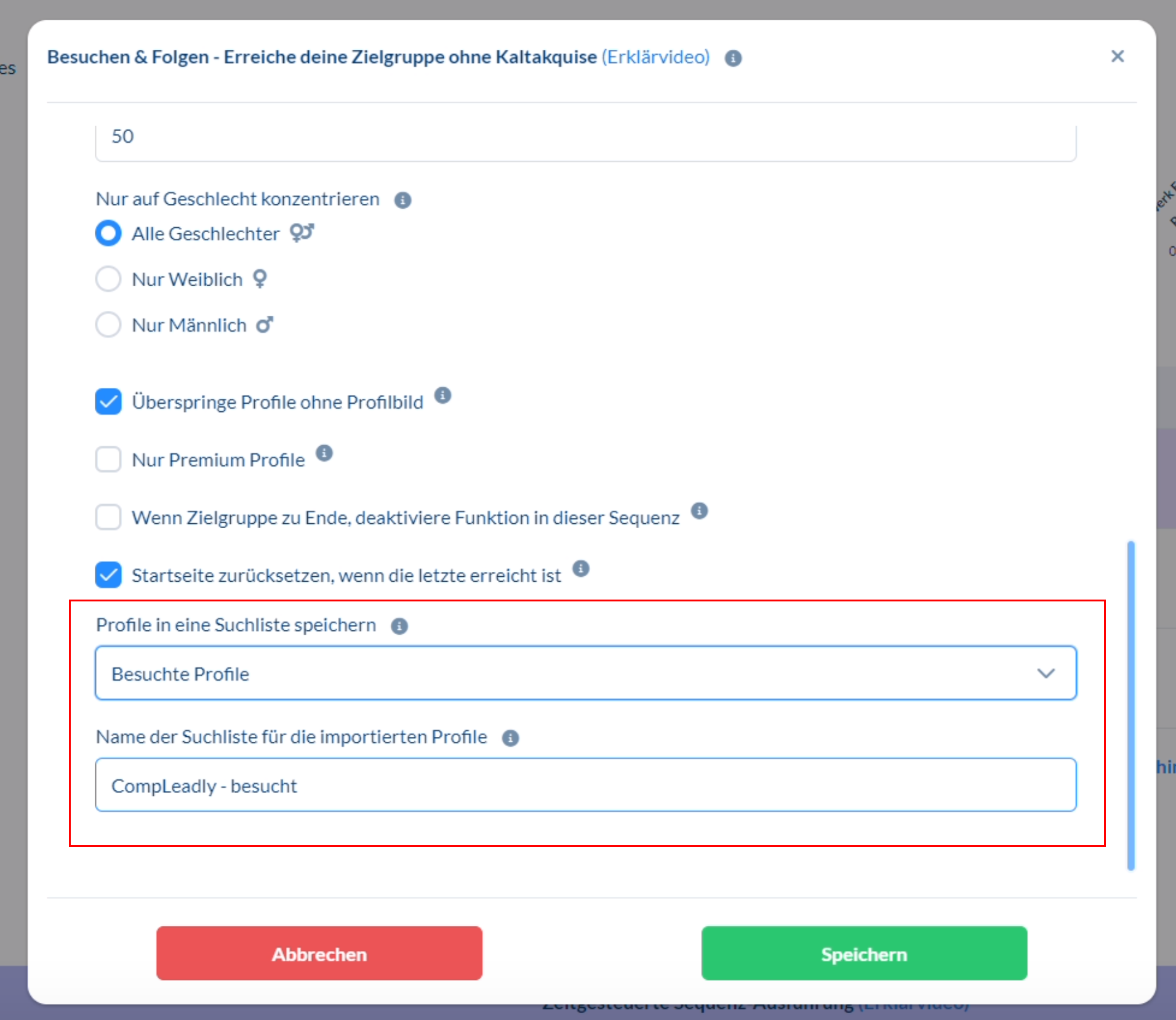 - Die letzte Einstellung wird ebenfalls wichtig, denn hier können wir die besuchten Leute in eine neue Zielgruppe automatisch speichern, die CompLeadly selbst erstellt und im nächsten Arbeitsschritt benutzen kann. Klicke dann auf "speichern".