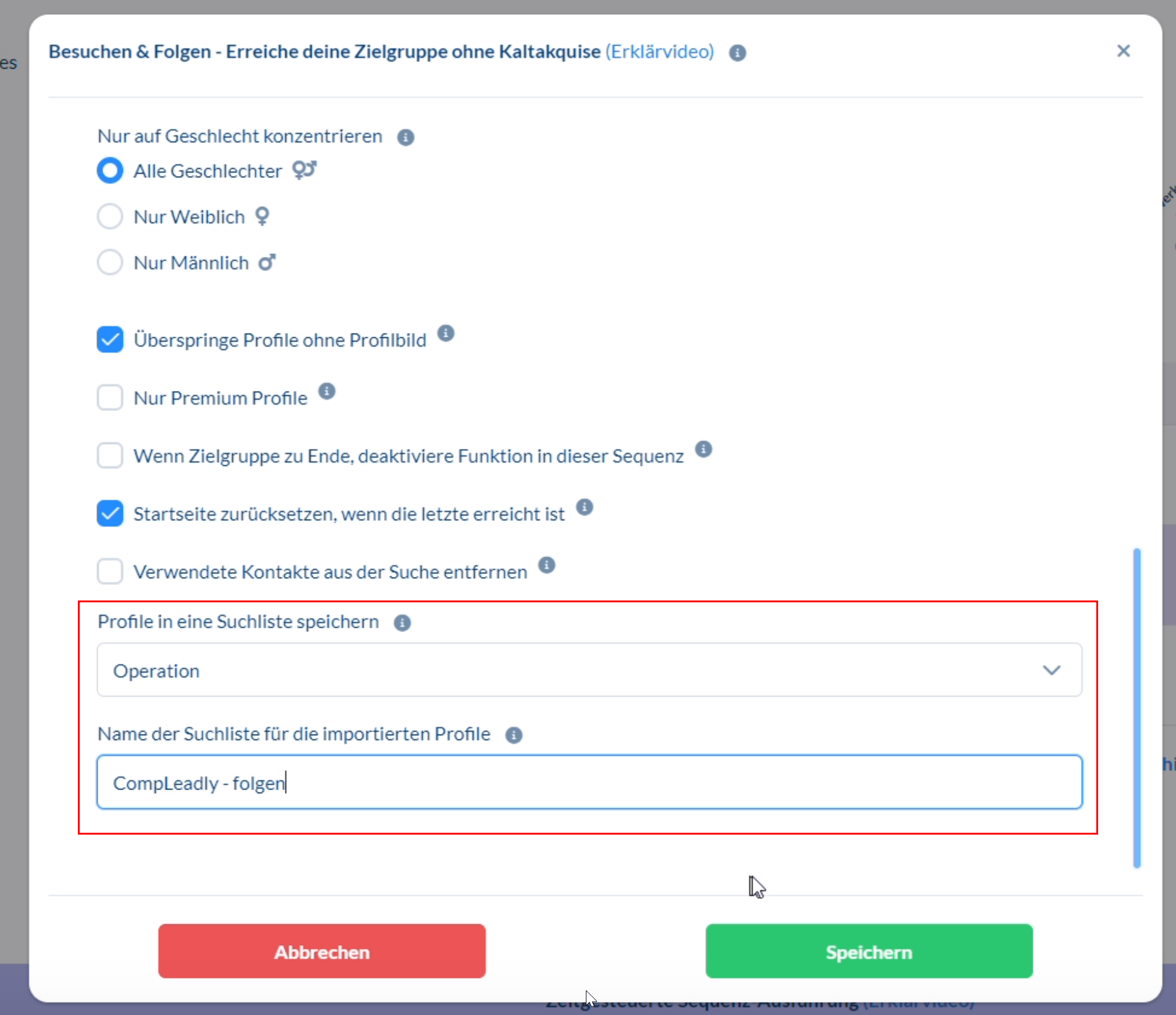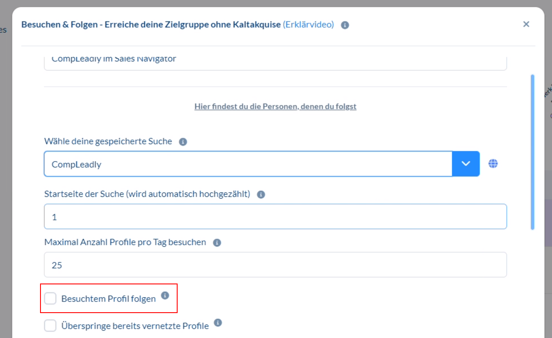 - Damit wir nun im letzten Schritt die Personen nach X Tagen vernetzen können, denen wir gefolgt haben, müssen wir CompLeadly in "Besuchen und Folgen 2" sagen, dass es wieder eine Zielgruppe erstellen soll, und zwar mit denen denen gefolgt wurde.