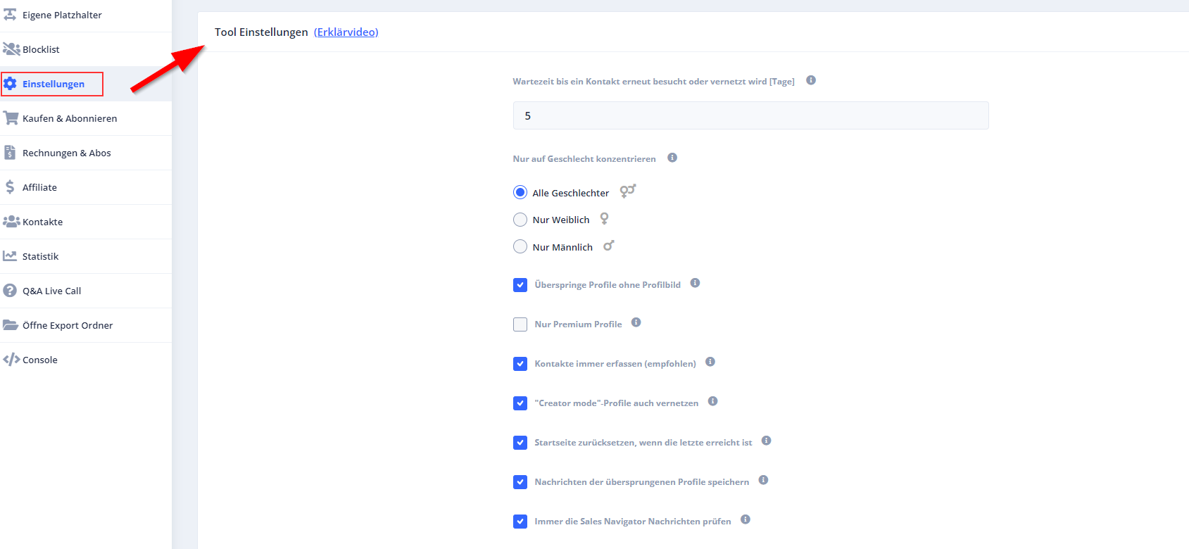 CompLeadly öffnet die LinkedIn oder Sales Navigator Suche und arbeitet von oben nach unten. Es gibt keine Priorisierung, aber CompLeadly überspringt z.B. Kontakte ohne Profilbild, was du in den Einstellungen links im Menü auch einstellen kannst.