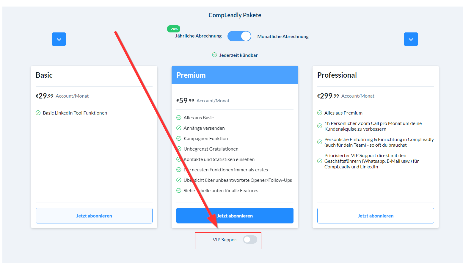 Preis ohne VIP Support und Abrechnungsfrequenz in CompLeadly ändern.