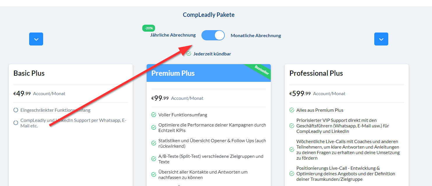 2) Auf der Website ist der Preis standardmäßig auf jährliche Abrechnung eingestellt. Das kannst du hier in CompLeadly umstellen: