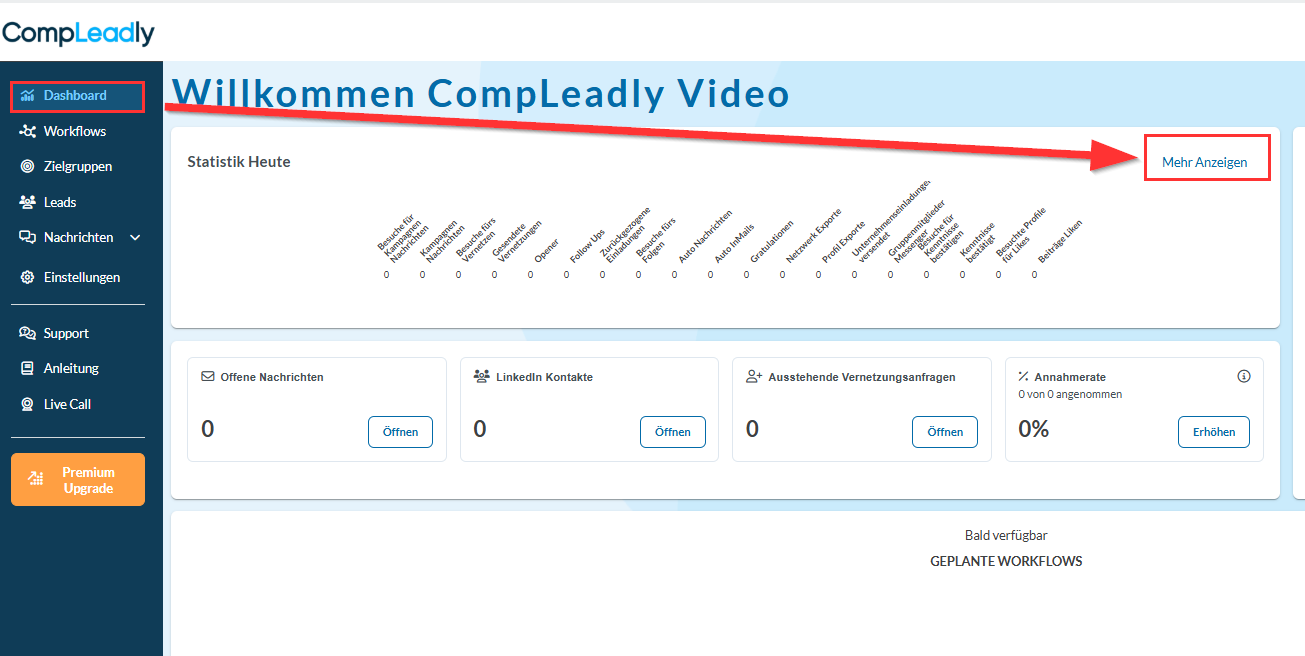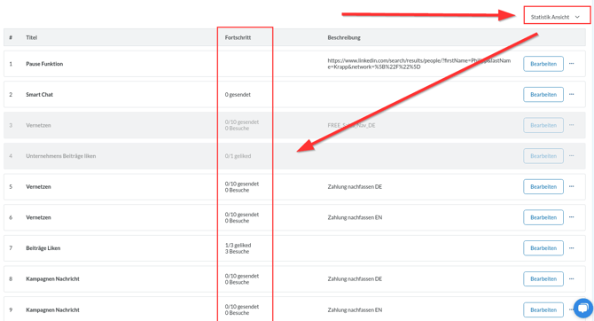 Wo finde ich die Statistikübersicht? Klicke über dem Workflow auf die Ansicht oben rechts und wähle Statistik-Ansicht aus. Du siehst dann den Fortschritt. Die eigentliche Statistik findest du im Dashboard hier: