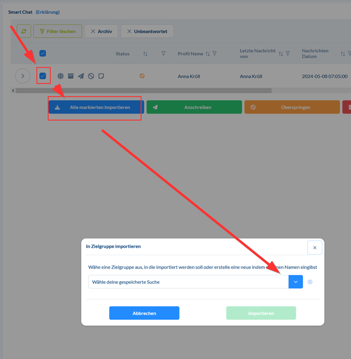 Um bestimmte Kontakte zu blockieren, beginnst du damit, diese in eine spezielle Zielgruppe zu überführen. Diese Zielgruppe kannst du beispielsweise "Blocklist" nennen. Wähle dazu einfach alle Kontakte aus, die du blockieren möchtest, und füge sie dieser Gruppe hinzu.