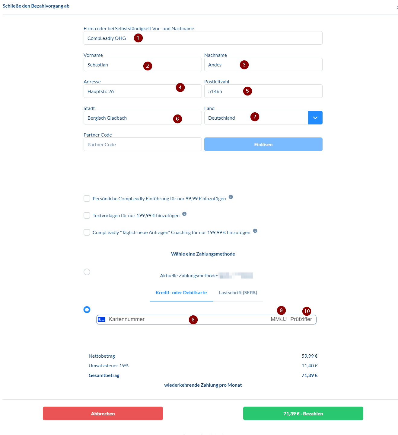Zahlungsdaten unvollständig Bei Zahlung mit Kreditkarte gibt es 10 Dinge, die du ausfüllen musst. Wenn du aus der EU kommst und nicht aus Deutschland, dann 11.