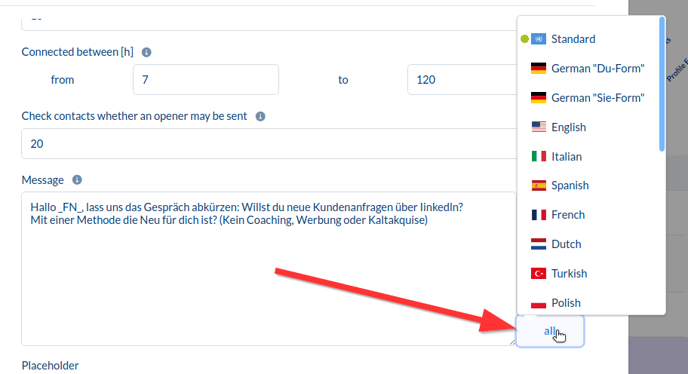For instance, if you only have English contacts, it's completely sufficient to set a text only under "Standard" and not additionally under "English".