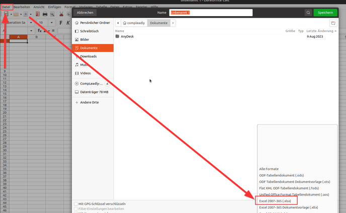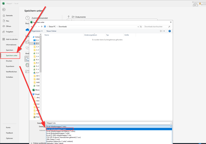 Then, in the Save dialog, select the file type ".xlsx".
