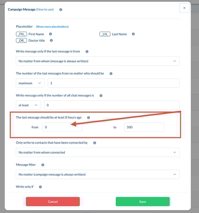 - Set Time Interval: Decide how long to wait after sending the opener message before the follow-up is sent. A typical interval might be seven days (i.e., 168 hours).