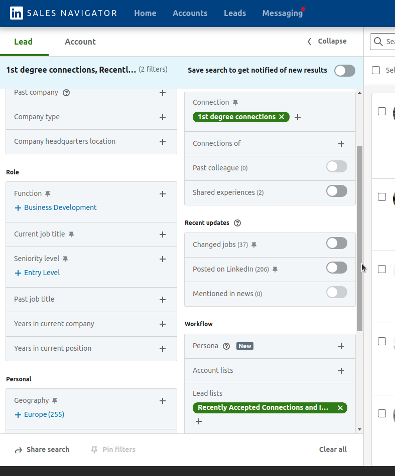 - Select Target Group: Define a target group by selecting contacts who have recently accepted your connection request. You can do this through the Sales Navigator settings "Contact" and "Lead Lists." Copy the generated link and paste it into the campaign messaging function.
