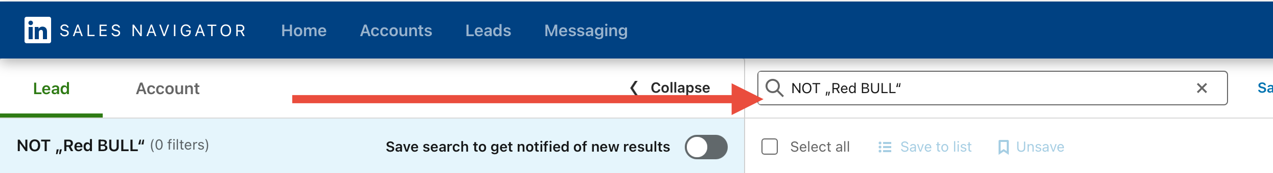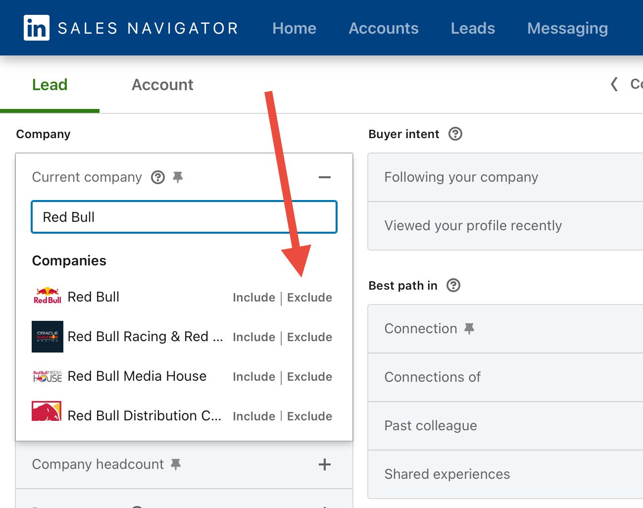 Exclude companies or employees of a company in Sales Navigator Example: Red Bull Select the company you want to exclude under "current company." Click on exclude. Or enter NOT "COMPANY NAME" in the keyword search.