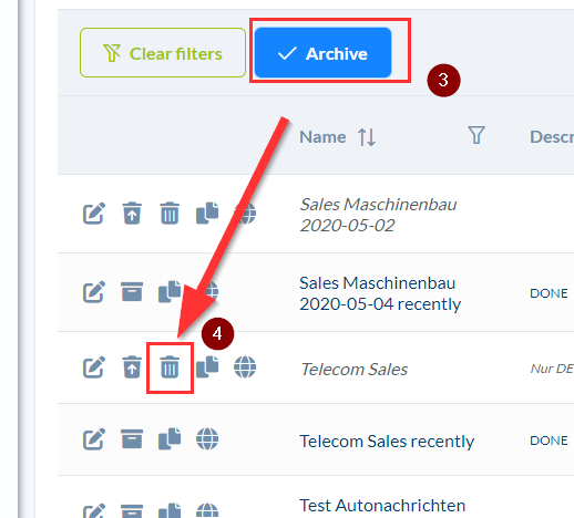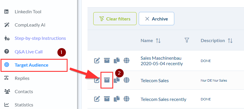 How can I delete target groups that have already been created? Target group ➔ Archive icon ➔ Archive button ➔ Trash can icon