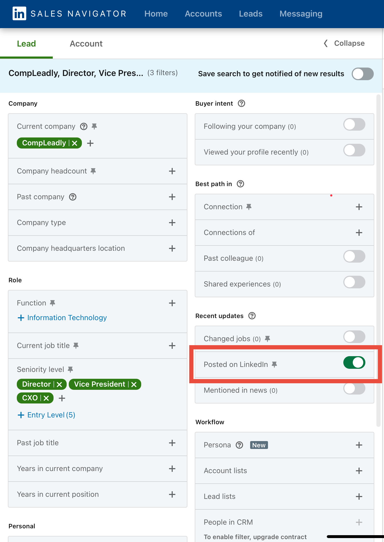 To optimize your target audience, we recommend using a specific filter in your lead searches in Sales Navigator, which only shows people who have posted something on LinkedIn in the last 30 days.